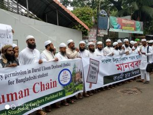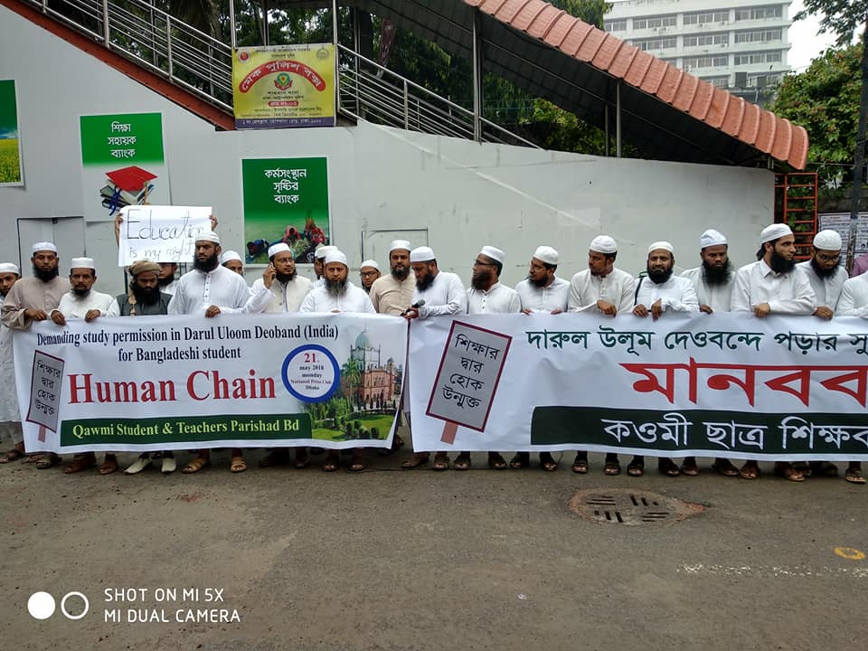 ভারতের দারুল উলুম দেওবন্দে বাংলাদেশের শিক্ষার্থীদের বৈধভাবে পড়ার সুযোগ প্রদানের দাবীতে আজ ২১ মে জাতীয় প্রেসক্লাবের সামনে মাদরাসা শিক্ষার্থীদের আধিকার আদায়ের সংগঠন ‘কওমী ছাত্র শিক্ষক পরিষদ’ এর মানববন্ধন অনুষ্ঠিত হয়েছে।