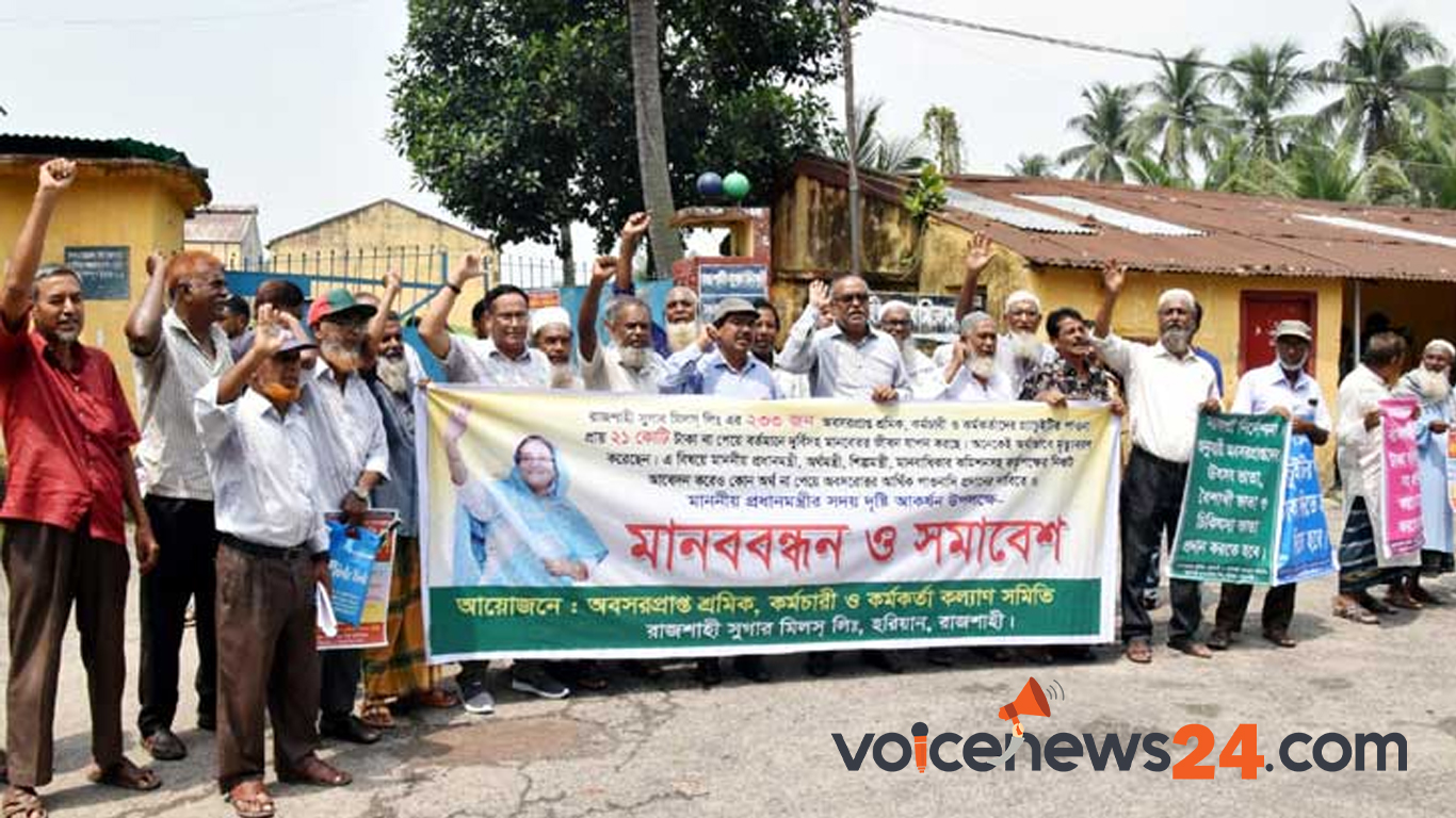 রাজশাহী চিনিকলের অবসরপ্রাপ্ত শ্রমিক, কর্মচারী ও কর্মকর্তারা বিক্ষোভ-সমাবেশ করেছে