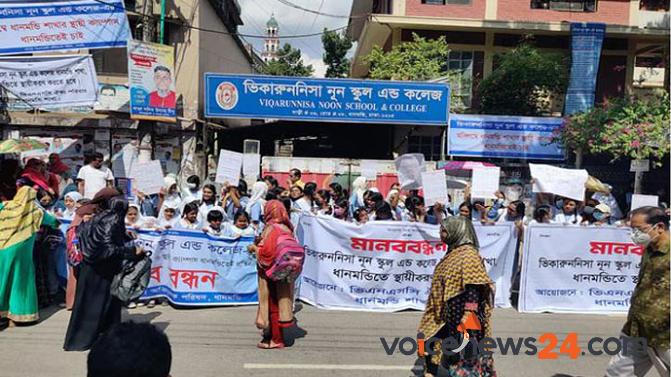 স্থায়ী ক্যাম্পাসের দাবিতে রাজধানীর ভিকারুননিসা নূন স্কুল অ্যান্ড কলেজের ধানমন্ডি শাখার শিক্ষার্থী ও অভিভাবকরা সড়ক আটকিয়ে বিক্ষোভ করছে।