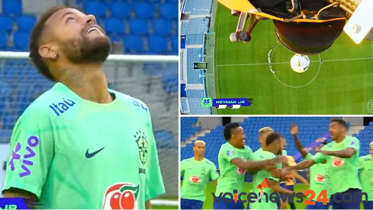 অনুশীলনের একপর্যায়ে ড্রোনের সাহায্যে প্রায় ১১৫ ফুট উঁচুতে বল নিয়ে তা শূন্যে ভাসিয়ে দেওয়া হয়। বল দ্রুতগতিতে নামতে থাকে নিচে। নেইমার সেই বল রিসিভ করতে পারেন কিনা, আগ্রহ ভরে দেখছিলেন সতীর্থরা।