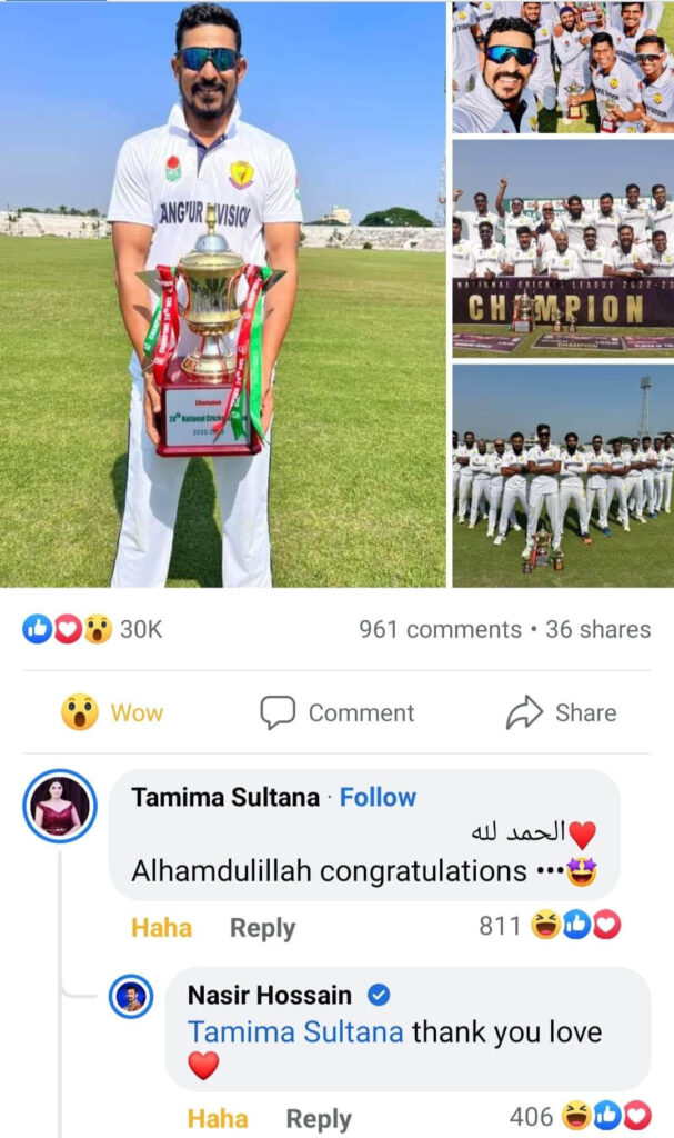 তবে আর সবারটা রেখে জ্বলজ্বল করছে নাসিরের সহধর্মিণী তামিমা সুলতানার কমেন্ট। এই শিরোপা জয়ে স্বামীকে অভিনন্দন জানাতে ভুললেন না তামিমা।