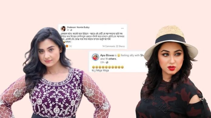 এবারের জন্মদিনে তিনি জীবনের সেরা উপহার পেয়েছেন বলেও তখন জানান। বুবলী বলেন, ‘জন্মদিনের সেরা উপহার ডায়মন্ডের নাকফুল, বীরের বাবা শাকিব খান দিয়েছে। গত সপ্তাহে আমাকে সে এই উপহার কিনে দিয়েছে। আমি আগে থেকে জানতাম না উপহারটি কী। যখন খুলে দেখলাম নাকফুল, দেখে আমার চোখে জল চলে এসেছিল। এটি হাতে নিয়ে আমি আবেগপ্রবণ হয়েছিলাম। আমি মনে করি, এ উপহার আমার জন্য তার অন্য রকমের ভালোবাসার বহিঃপ্রকাশ।’অপু বিশ্বাস ও শবনম বুবলীঅপু বিশ্বাস ও শবনম বুবলীকোলাজআর এই খবর পৌঁছে যায় অপু বিশ্বাসের কান পর্যন্ত। শাকিব খানের কাছ থেকে পাওয়া বুবলীর এই উপহারের খবরটি নিয়ে অপু ফেসবুকে একটি পোস্ট দেন। ‘শাকিবের কাছ থেকে ডায়মন্ডের নাকফুল পেয়ে বুবলীর চোখে জল’, এমন শিরোনামের একটি সংবাদ নিজের ফেসবুক ওয়ালে শেয়ার করে একাধিক হাসির ইমোটিকন দিয়েছেন অপু বিশ্বাস। শুধু তা-ই নয়, অপু লিখেছেন, ‘কী যে মজা, মজা।’ ফেসবুকে অপু বিশ্বাসের সেই পোস্টের মন্তব্যের ঘরে তাঁর শুভাকাঙ্ক্ষীরা নানা ধরনের মন্তব্য করেছেন। কেউ কেউ লিখেছেন, ‘জাতি ডায়মন্ডের ফুলটা দেখতে চায়।’ আবার কেউ লিখেছেন, ‘আহা রে! সান্ত্বনামূলক উপহার।’ চিত্রনায়িকা সুবহা মজা করে লিখেছেন, ‘হালকা পেঁপে কালার।’অপু বিশ্বাসঅপু বিশ্বাসছবি:ফেসবুক থেকে।অপু বিশ্বাসের এমন পোস্টের কয়েক ঘণ্টা পর আজ সকালে শবনম বুবলী নিজের ফেসবুকে একটি পোস্ট লিখেছেন। বুবলীর লেখা সেই পোস্ট হুবহু এ রকম, ‘একজন হঠাৎ করেই বলে উঠল…আপনাদের ছবিসহ নিউজ তার নিজের ফেসবুক ওয়ালে বাঁধাই করে রাখছে। এটাই তো আপনার মজা, তার শয়নে স্বপনে শুধুই আপনি। হাহাহা।’শবনম বুবলীশবনম বুবলীঅপু বিশ্বাস ও শবনম বুবলীর বৈরিতার খবর দেশের বিনোদন দুনিয়ায় চর্চিত। অপু ও বুবলীর দুজনের নানা কর্মকাণ্ডেও তাঁদের সম্পর্ক যে ভালো নয়, তা বারবার স্পষ্ট হয়েছে। এর মধ্যে গতকাল ঘটল একেবারে ভিন্ন ঘটনা। বুবলীকে নিয়ে প্রকাশিত একটি সংবাদ নিজের ফেসবুক ওয়ালে পোস্ট করেন অপু বিশ্বাস, যা নিকট অতীতে হয়নি। তাই বিষয়টা বিনোদন অঙ্গনের সবাইকে হতবাক করেছে। অনেকে ভাবতে থাকেন, তাহলে কি বুবলী-অপুর মধ্যে সম্পর্ক ভালো হয়ে গেছে? আদতে বিষয়টা যে তা নয়, সেটা পোস্টে শেয়ার করা ক্যাপশনের কয়েকটি শব্দের মাধ্যমে পরিষ্কার ইঙ্গিত পাওয়া যায়। বিনোদন অঙ্গনের অনেকে বলেছেন, এই পোস্ট শেয়ার করে বুবলীকে এক রকম খোঁচা মেরেছেন অপু বিশ্বাস। বুবলীও বেশি সময় নিলেন না অপুকে খোঁচা মারতে।