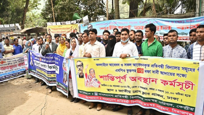 ছয় দফা দাবিতে অবস্থান কর্মসূচি শুরু করেছে দেশের প্রতিবন্ধী বিদ্যালয়ের শিক্ষক ও কর্মচারীরা।