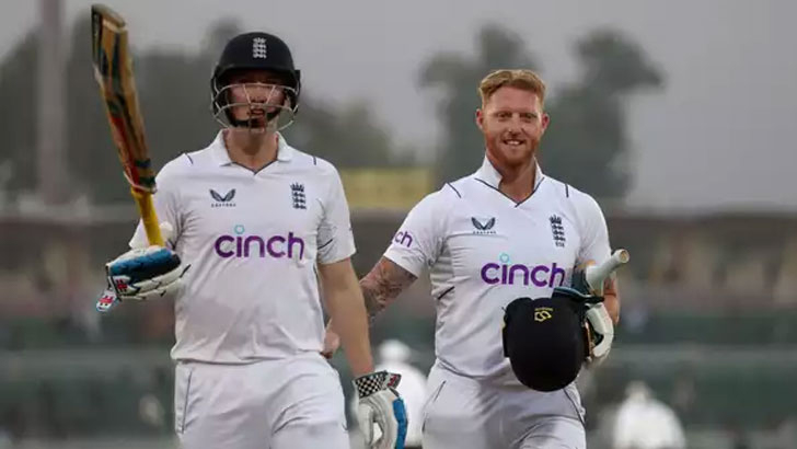 ওলি পোপ ১০৪ বলে ১০৮ এবং হ্যারি ব্রুক মাত্র ৮১ বলে ১০১ রান নিয়ে ব্যাট করছেন। ৩৪ রানে অপরাজিত অধিনায়ক বেন স্টোকস। দুটি উইকেট নেন জাহিদ মাহমুদ। একটি করে উইকেট পান মোহাম্মদ আলী ও হারিস রউফ।