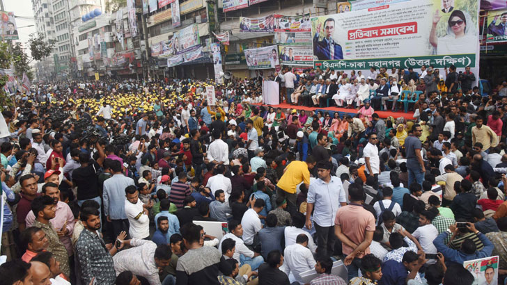 এদিকে প্রতিবাদ সমাবেশকে ঘিরে বিএনপির কার্যালয়ের সামনের রাস্তার এক পাশে নাইটিংগেল—ফকিরাপুলের মোড় বন্ধ ছিল। অপ্রীতিকর ঘটনা এড়াতে কঠোর অবস্থানে ছিলেন আইনশৃঙ্খলা বাহিনীর সদস্যরা।