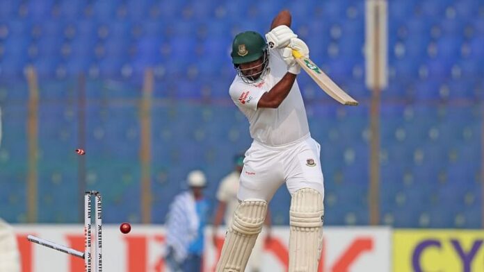 রবিচন্দ্রন অশ্বিনের ফিফটি, কুলদীপ যাদবের ৪০ রান, অষ্টম উইকেটে দুজনের ৯২ রানের জুটির পর উমেশ যাদবের ১০ বলে ১৫ রানের ক্যামিওতে চট্টগ্রাম টেস্টের প্রথম ইনিংসে ৪০৪ রান তুলেছে ভারত। দ্বিতীয় দিন ৪ উইকেটে আরও ১২৬ রান যোগ করেছে তারা। তাইজুল ইসলাম ও মেহেদী হাসান মিরাজ নিয়েছেন ৪টি করে উইকেট। জবাবে প্রথম ইনিংসে চা-বিরতির আগে ব্যাটিংয়ে নেমে ওপেনার নাজমুল হোসেন ও তিনে আসা ইয়াসির আলীর উইকেট হারিয়ে ৩৭ রান নিয়ে চা-বিরতিতে গেছে বাংলাদেশ। ২৬ বলে ২৪ রান করা লিটনের সঙ্গী ১৬ বলে ৯ রান করা জাকির হাসান। প্রথম ইনিংসে বাংলাদেশ এখন পিছিয়ে ৩৬৭ রানে। বাংলাদেশ প্রথম ধাক্কা খায় ইনিংসের প্রথম বলেই। মোহাম্মদ সিরাজের অফ স্টাম্পের বাইরের বলে খোঁচা দিয়ে উইকেটকিপার ঋষভ পন্তের হাতে ধরা পড়েন নাজমুল হোসেন। এ নিয়ে ১৩তম বার কোনো বাংলাদেশ ওপেনার ‘গোল্ডেন ডাক’ পেলেন। তবে ইনিংসের প্রথম বলেই কোনো বাংলাদেশি ব্যাটসম্যানের আউট হওয়ার ঘটনা এর আগে ছিল সাতটি। উমেশ যাদবের করা দ্বিতীয় ওভারে শরীর থেকে দূরে খেলতে গিয়ে স্টাম্পে বল ডেকে আনেন ইয়াসির। আরও পড়ুনদ্রুত ২ উইকেট হারানোর চাপ অবশ্য আক্রমণে দেওয়ার চেষ্টা করেছেন এরপর লিটন দাস ও অভিষিক জাকির হাসান। অষ্টম ওভারে উমেশকে টানা দুটি চার মেরেছেন লিটন, পরের ওভারে অশ্বিনকে ৩ বলের মধ্যে ২টি মেরেছেন জাকির। বিরতির ঠিক আগে উমেশকে টানা তিন চার মেরেছেন লিটন।এর আগে প্রথম সেশনে বাংলাদেশ পায় শুধু শ্রেয়াস আইয়ারের উইকেট। আগের দিন ইবাদতই ফেলেছিলেন শ্রেয়াসের সহজতম ক্যাচ, ইবাদতের বল স্টাম্পে লাগলেও বেঁচে গিয়েছিলেন বেল না পড়াতে। আজ সেই ইবাদতের বলেই আরেকবার বেঁচে যান ডিপ ফাইন লেগে লিটন দাস ক্যাচ ফেলায়। শ্রেয়াস তবুও সেঞ্চুরির দেখা পাননি, থেমেছেন ১৪ রান দূরেই। আগের দিনের স্কোরের সঙ্গে মাত্র ৪ রান যোগ করেই ফেরেন তিনি।