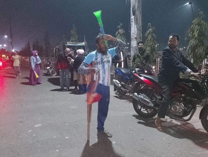 আরিফুল ইসলামের (৩৭) একটি পা নেই। ক্র্যাচে ভর দিয়ে প্রিয় ফুটবল দল আর্জেন্টিনার জয়োল্লাসের মিছিলে যোগ দেন তিনি। সবার সঙ্গে জয়ের আনন্দ ভাগাভাগি করে নিতে গতকাল রোববার মধ্যরাতে ছুটে আসেন যশোর শহরের প্রাণকেন্দ্র দড়াটানায়। আর্জেন্টিনার জার্সি পরে বাঁধভাঙা উল্লাসে ফেটে পড়েন তিনি।আরিফুল যশোর শহরের ধর্মতলা খোলাডাঙ্গা মসজিদপাড়া এলাকার বাসিন্দা। ইজিবাইক চালিয়ে সংসার চালান। পাঁচ বছর বয়সে ট্রাক দুর্ঘটনায় তিনি ডান পা হারান। ছোটবেলা থেকে আর্জেন্টিনার সমর্থক আরিফুল। প্রিয় দলের ফাইনাল খেলা উপলক্ষে গতকাল সারা বিকেল এলাকার আর্জেন্টাইন শিশু সমর্থকদের শহর ঘোরান।আরিফুল ইসলাম বলেন, ‘এলাকার বাচ্চাদের কথা দিয়েছিলাম আর্জেন্টিনা ফাইনালে গেলে নিজের ইজিবাইকে করে তাদের শহর ঘুরাব। সেই কথা রাখতেই বিকেলে তাদের নিয়ে শহর ঘুরেছি।’ তাঁর ছয় বছর বয়সী ছেলে আছে। সেও বাবার দলের সমর্থক, তবে তাঁর স্ত্রী ব্রাজিলের সমর্থক। বলে তিনি জানান। তিনি বলেন, ‘কাতার বিশ্বকাপে স্বপ্নের মতোই খেলেছে আর্জেন্টিনা। কয়েকবার ফাইনাল খেললেও এবার শক্তিশালী ফ্রান্সকে হারিয়ে ট্রাফি জয়ের তৃষ্ণা মিটিয়েছে ফুটবলের জাদুকর লিওনেল মেসি। বিজয়কে স্মরণীয় করে রাখতে খেলা শেষেই দড়াটানায় চলে এসেছি। একসঙ্গে বিজয় উদ্যাপন করেছি। এ জয় ফুটবলের, এ জয় মেসির।’এক পায়ে ভর দিয়ে আরিফুল যে জয়ের আনন্দ ভাগাভাগি করতে এসেছেন, এ নিয়ে উচ্ছ্বসিত অন্য সমর্থকেরা। তাঁদের অনেকে তাঁর সঙ্গে ছবি তুলেছেন।