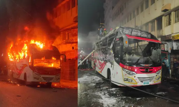 এরশাদ শিকদার বলেন, বাসের আগুন নিভে গেছে। তবে পাশের বিল্ডিং মমতাজ ম্যানশনে এখন অল্প আগুন আছে। সেটাও নেভানোর কাজ চলছে।
