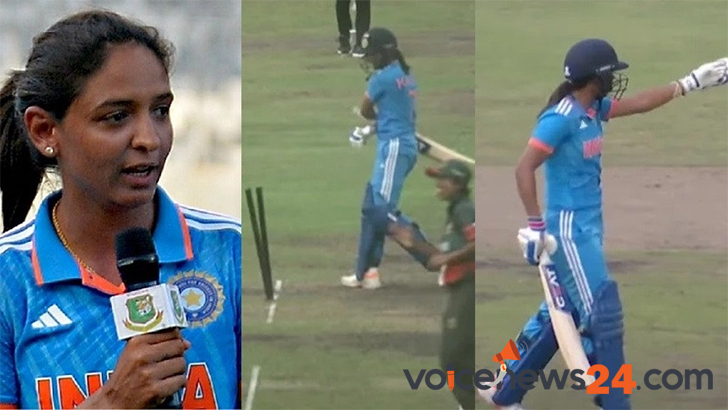 নাহিদা আক্তারের জোরালো আবেদনে আম্পায়ার তানভির আহমেদ আঙুল তুলতেই ক্ষিপ্ত প্রতিক্রিয়া দেখান হারমানপ্রীত। আম্পায়ারের দিকে আগুনে দৃষ্টিতে শুরু ও শেষের মাঝে ব্যাট দিয়ে স্টাম্প ভেঙে সাজঘরে ফেরার পথে গ্যালারির দর্শকদের উদ্দেশে ‘থাম্পস আপ’ দেখিয়েছেন হারমানপ্রীত। ১২৭ ওয়ানডে খেলা অভিজ্ঞ ক্রিকেটারের এই প্রতিক্রিয়া যে ইতিবাচক কিছু নয়, সেটি দর্শকদের বুঝতে সমস্যা হওয়ার কথা নয়।